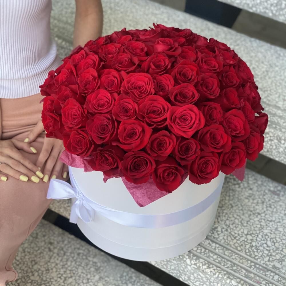роза красная фридом – 75 шт. Коробка – 1 шт. Оазис – 4 шт. Оформление – 1 шт.