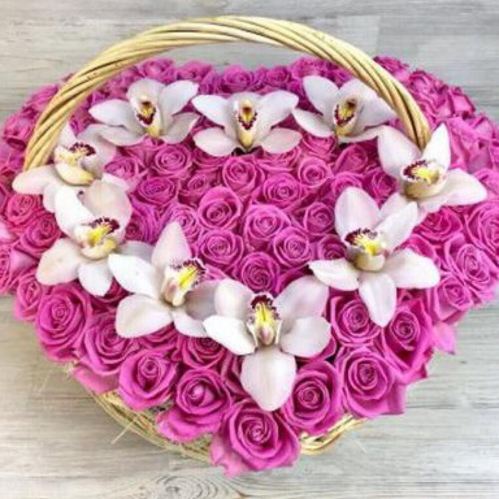 Розовая роза – 79 шт.орхидея соцветия – 9 шт.Корзина плетеная – 1 шт.Оазис флористический – 3 шт.
