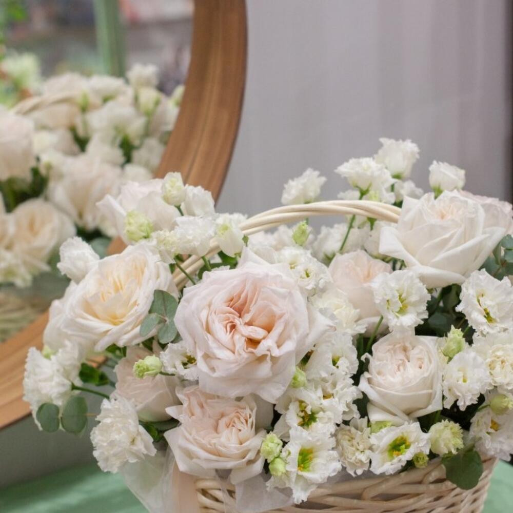 Пионовидная роза – 14 шт.Лизиантус – 7 шт.Диантус – 12 шт.Эвкалипт – 10 шт.Корзина плетеная – 1 шт.
