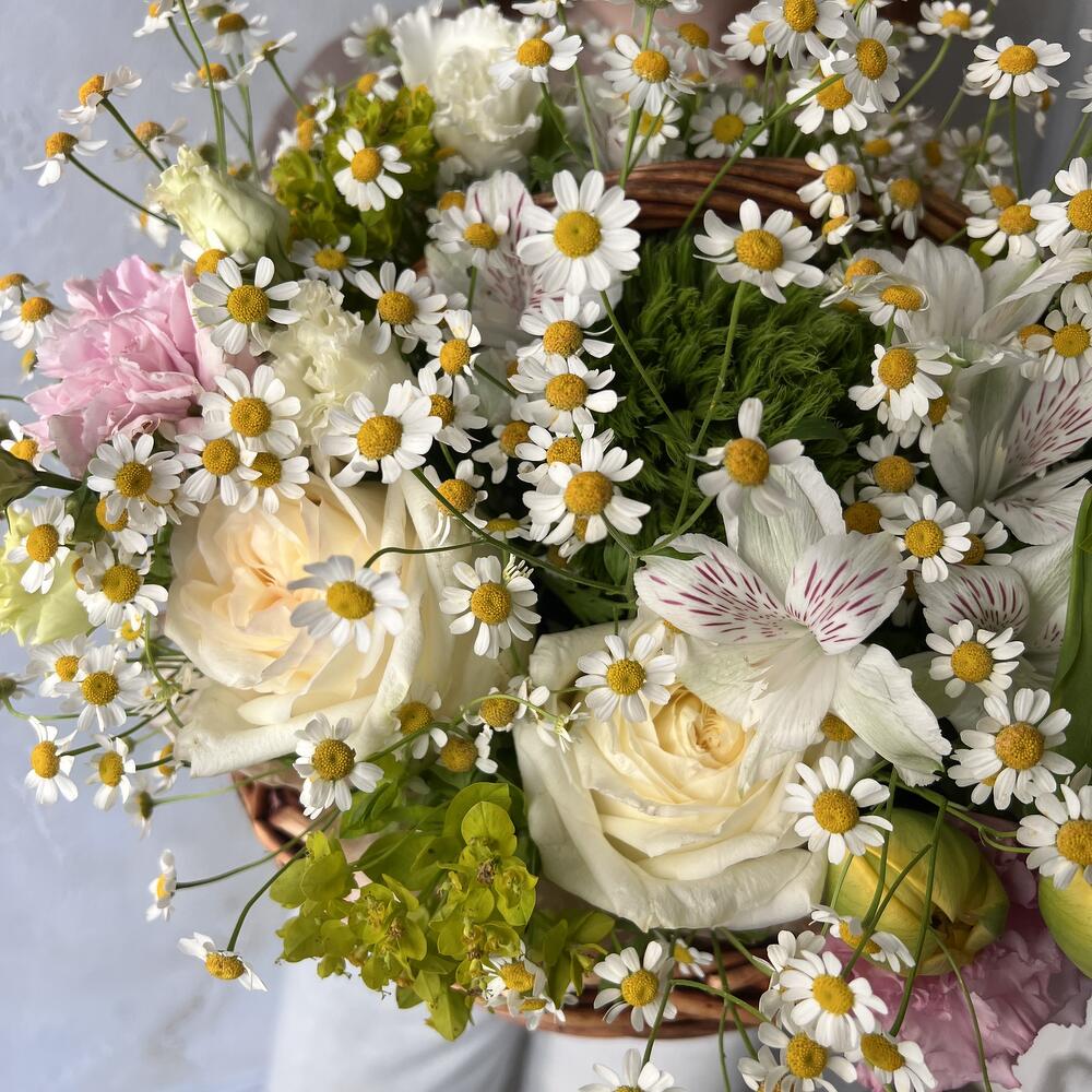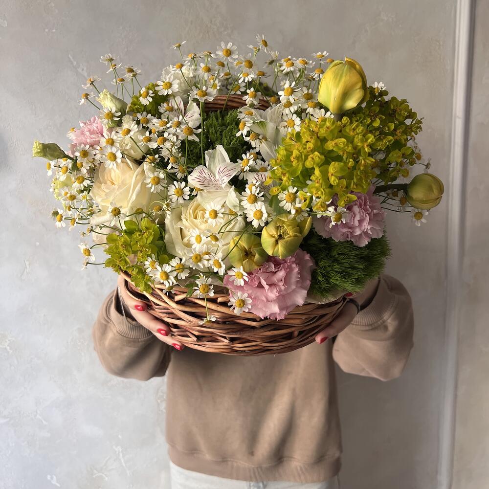 Корзина с нежными розами, тюльпанами и ромашками