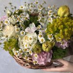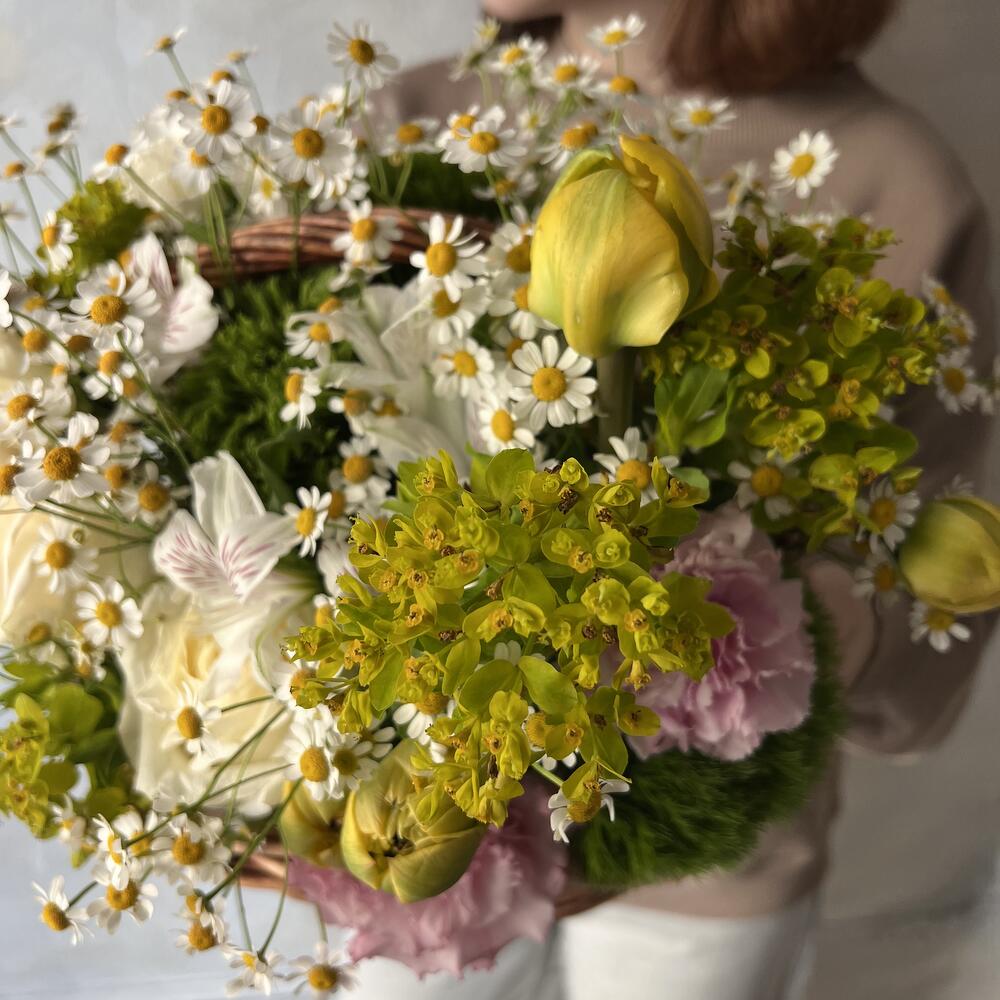 Альстромерия – 2 шт.Корзина – 1 шт.Лизиантус – 1 шт.Тюльпан – 4 шт.Роза – 3 шт.Гвоздика – 3 шт.Оазис – 1 шт.Матрикария – 7 шт.Молочай – 4 шт.гринтрик – 4 шт.