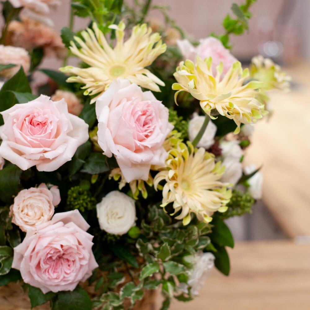 Гербера – 10 шт.Роза пионовидная кустовая – 3 шт.Роза кустовая – 6 шт.роза хитоми – 6 шт.Роза пионовидная – 5 шт.Диантус – 8 шт.Скиммия – 5 шт.Питтоспорум – 5 шт.Эвкалипт – 7 шт.Молюцелла – 3 шт.
