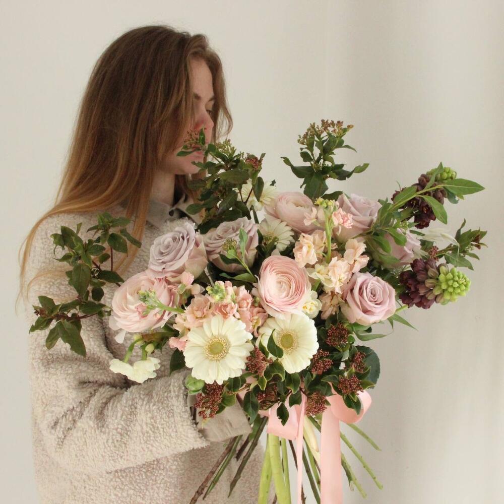 Круглый розовый букет с ранункулусами