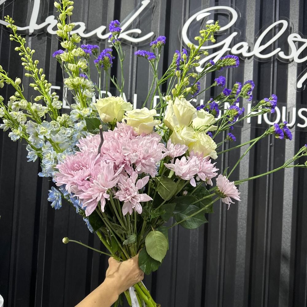Дельфиниум – 5 шт. Статица – 3 шт. Роза мондиаль 60 см – 6 шт. Хризантема кустовая – 6 шт.