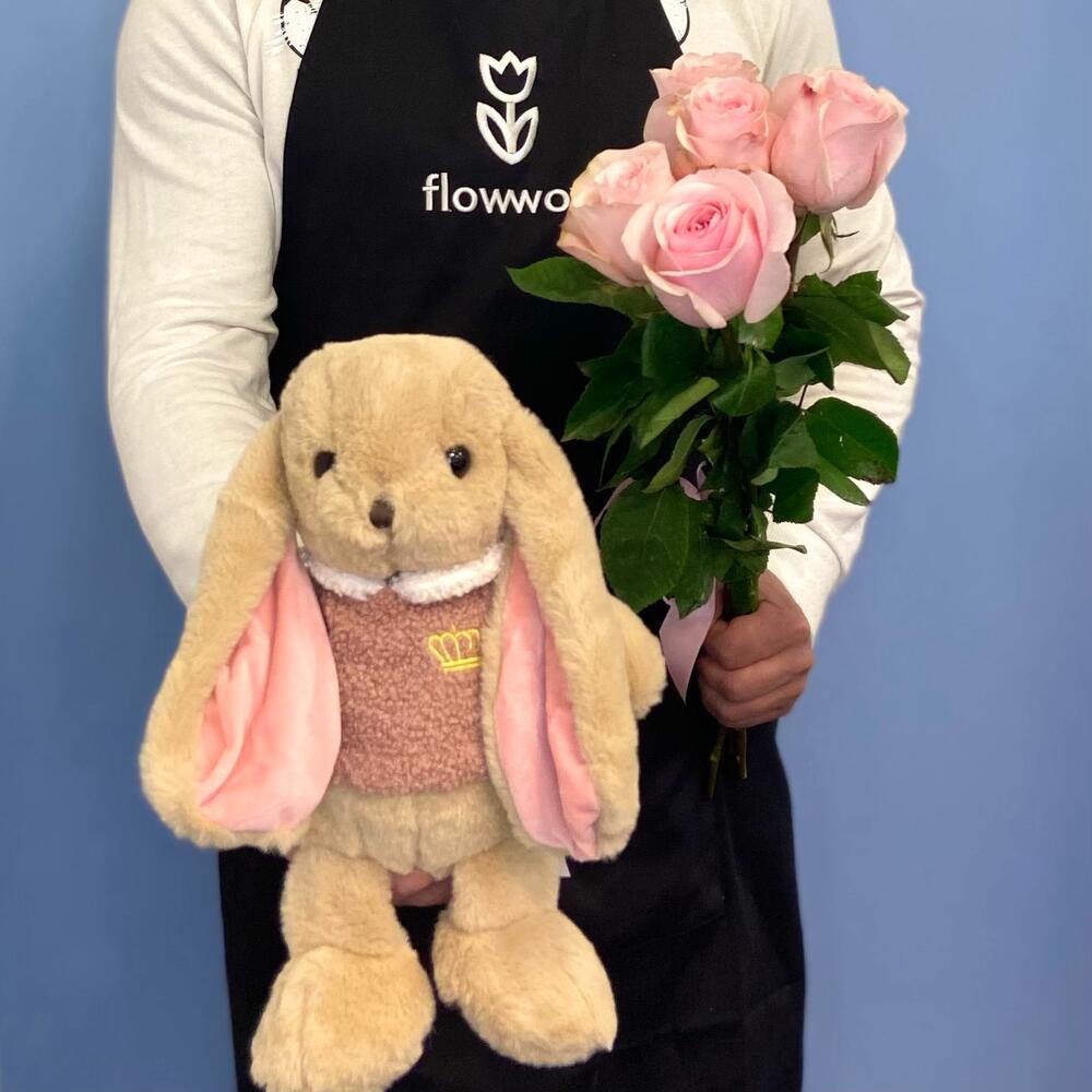 розовые розы – 5 шт.Лента атласная – 1 шт.Зайка – 1 шт.