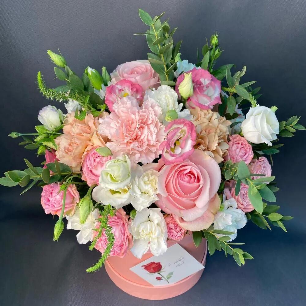 Альстромерии, Гвоздики, Кустовые розы, Лизиантусы, Розы, Хризантемы