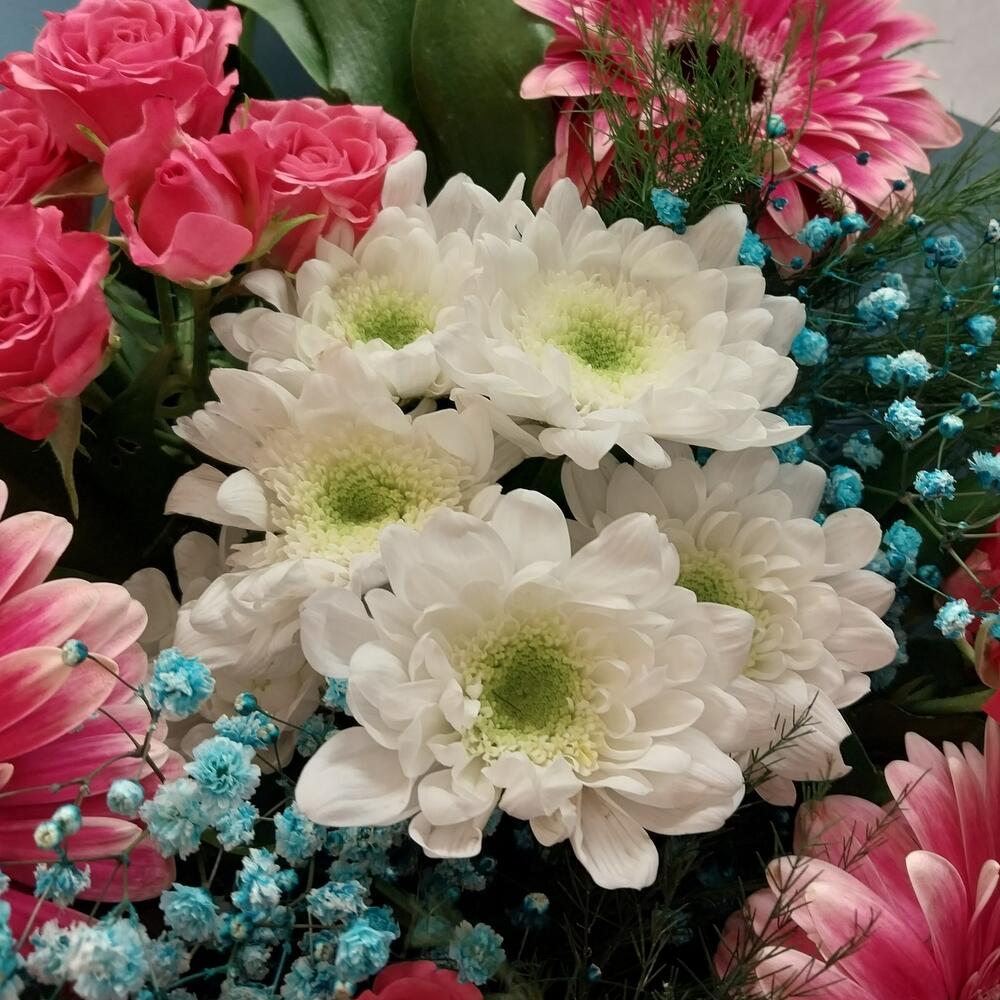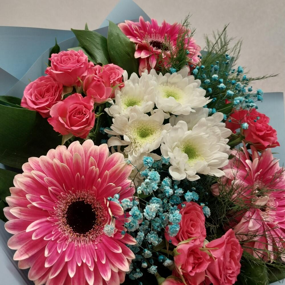 Категорий: Герберы, Гипсофила, Кустовые розы, Розы, Хризантемы