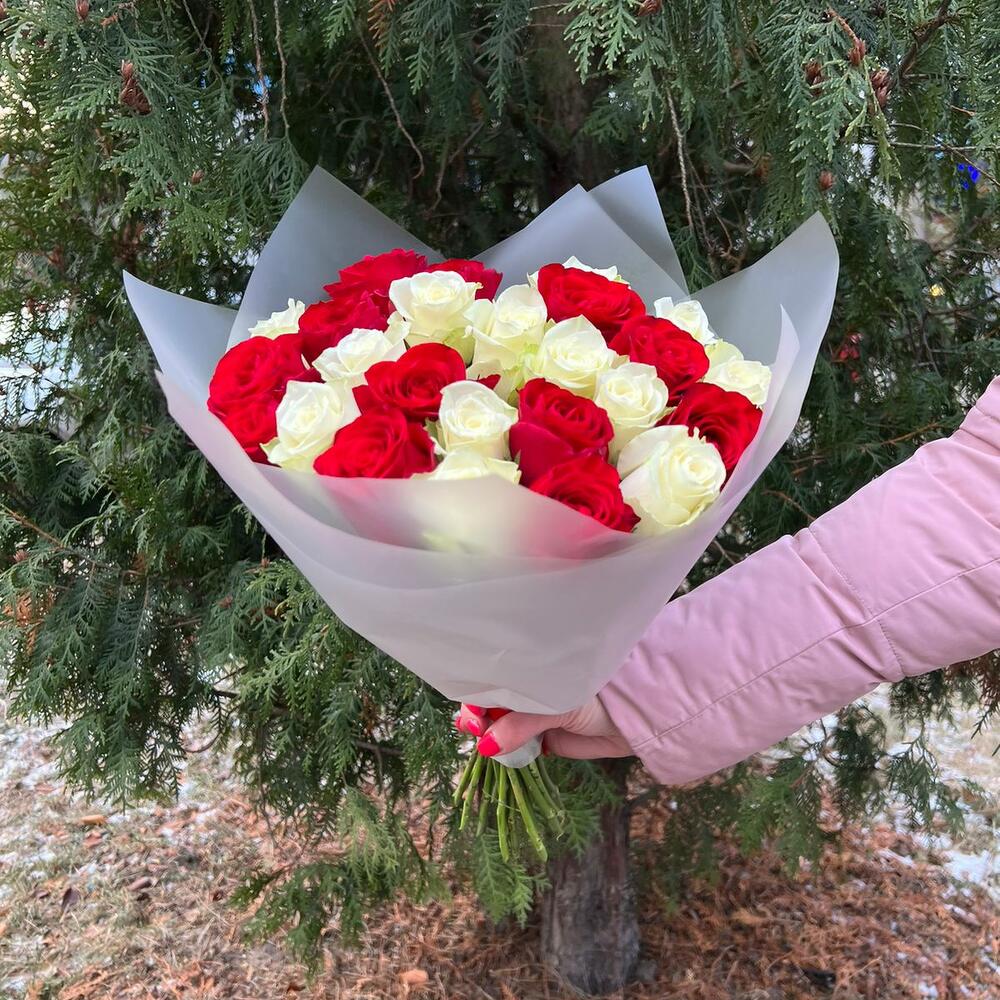 Роза красная – 13 шт.Роза белая – 12 шт.Пленка матовая – 1 шт.
