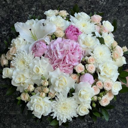 Гортензия – 1 шт. Рускус – 5 шт. Хризантема кустовая – 5 шт. Роза – 18 шт. Хризантема – 5 шт. Диантус – 5 шт. Спрей роза – 5 шт. бумага дизайнерская – 1 шт.