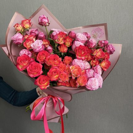 Роза кустовая – 29 шт. Упаковка – 1 шт. Атласная лента – 1 шт.