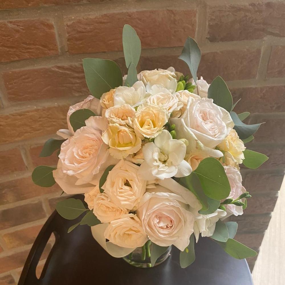 Эвкалипт Популус – 2 шт.Лента атласная – 1 шт.Фрезия белая – 5 шт.кустовая роза кения кремовая – 6 шт.роза white o’hara – 7 шт.
