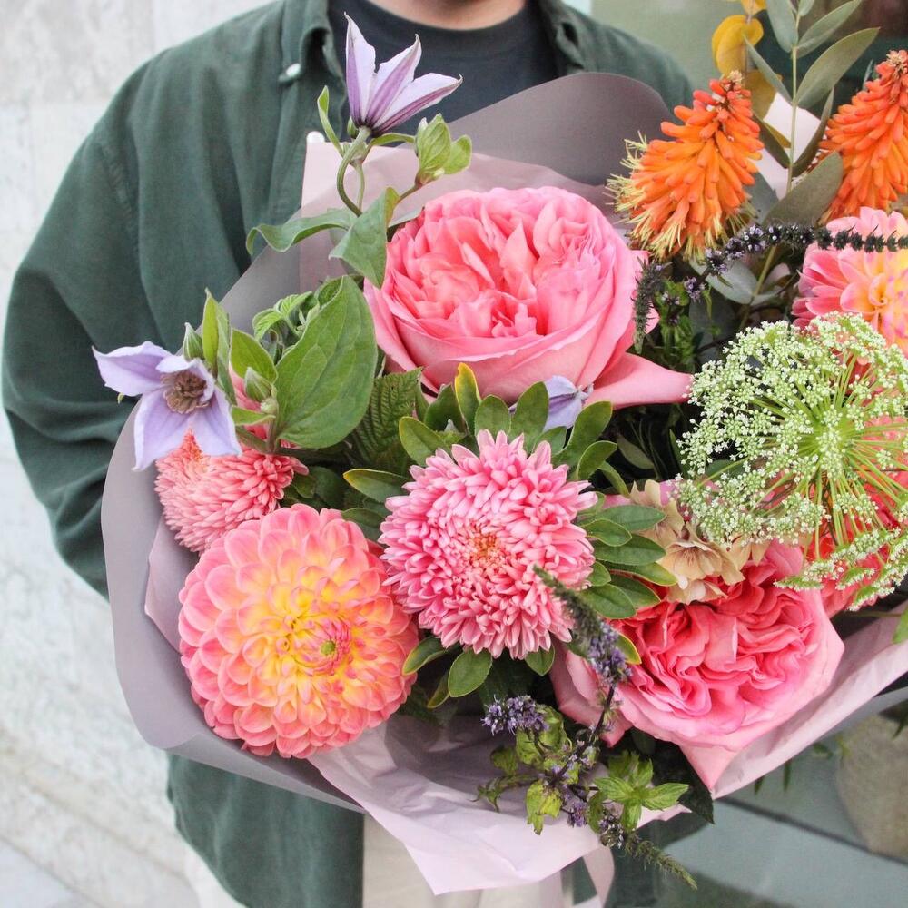 Эрингиум – 1 шт.книффония – 2 шт.Роза пионовидная – 2 шт.Астра – 3 шт.Клематис – 1 шт.Мята – 2 шт.эвкалипт стабилизируемый – 2 шт.Эвкалипт – 3 шт.Фисташка – 3 шт.Упаковка – 1 шт.