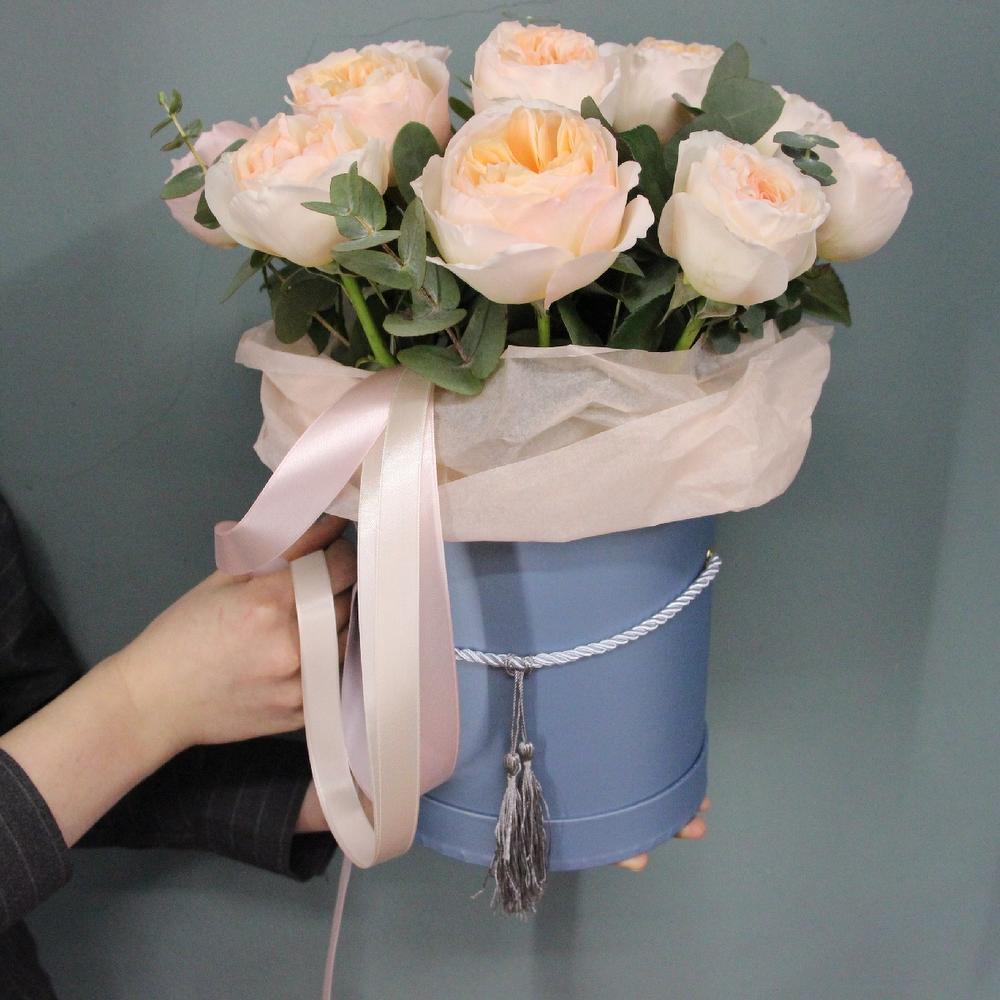 Шляпная коробка с 15 пионовидными английскими розами и эвкалиптом.Стильное цветочное решение для любого случая.Ширина композиции около 40смВысота композиции около 50см.