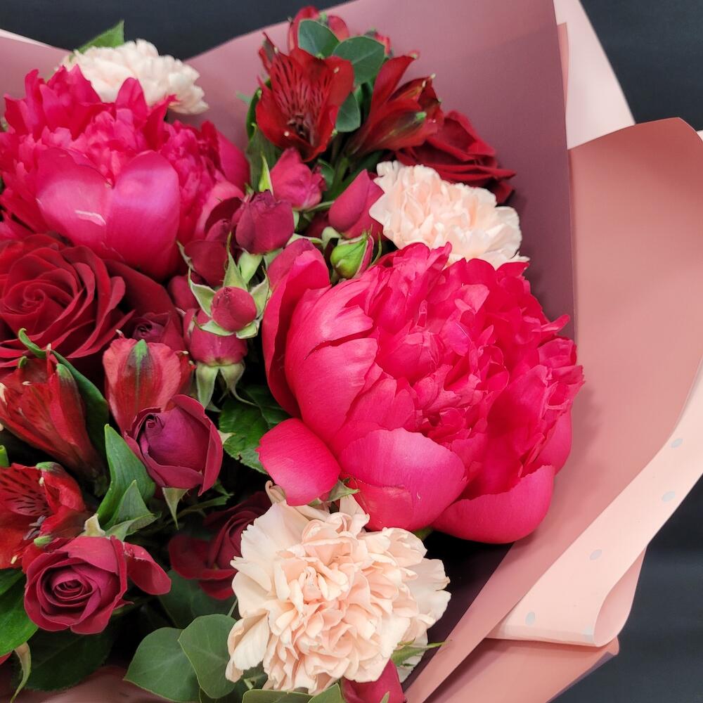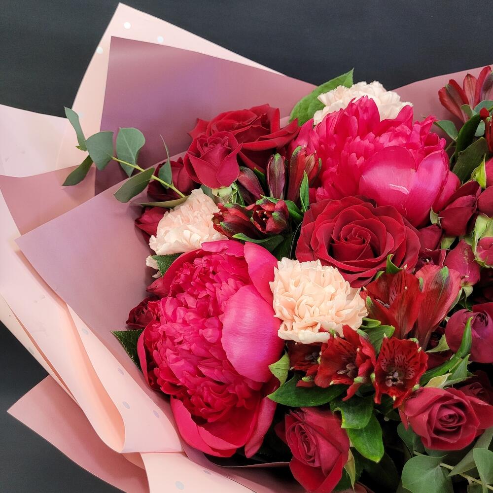 Гвоздики, Лизиантусы, Розы, Тюльпаны
