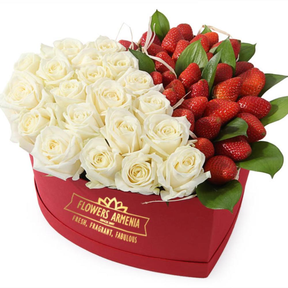 Клубника – 35 шт. Коробка красная – 1 шт. белые розы – 25 шт.
