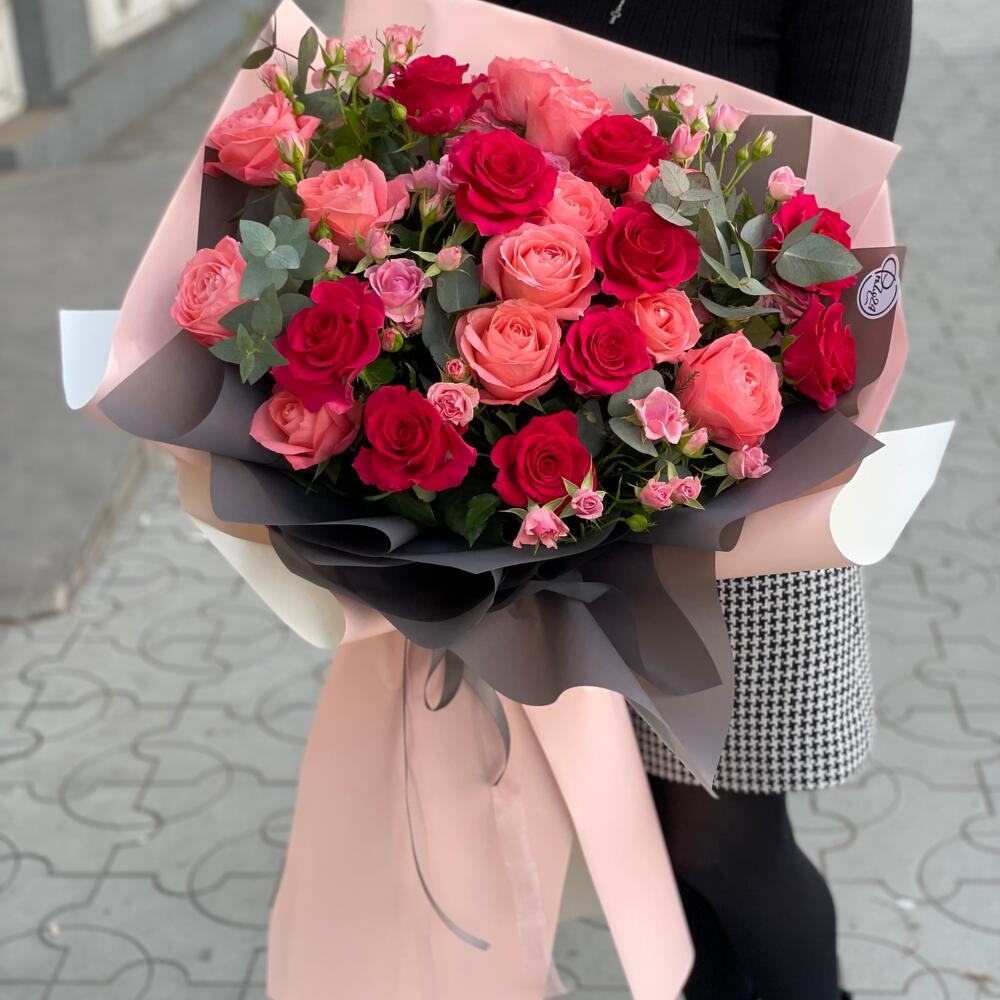 Альстромерии, Кустовые розы, Лизиантусы, Пионовидные розы, Розы, Ромашки