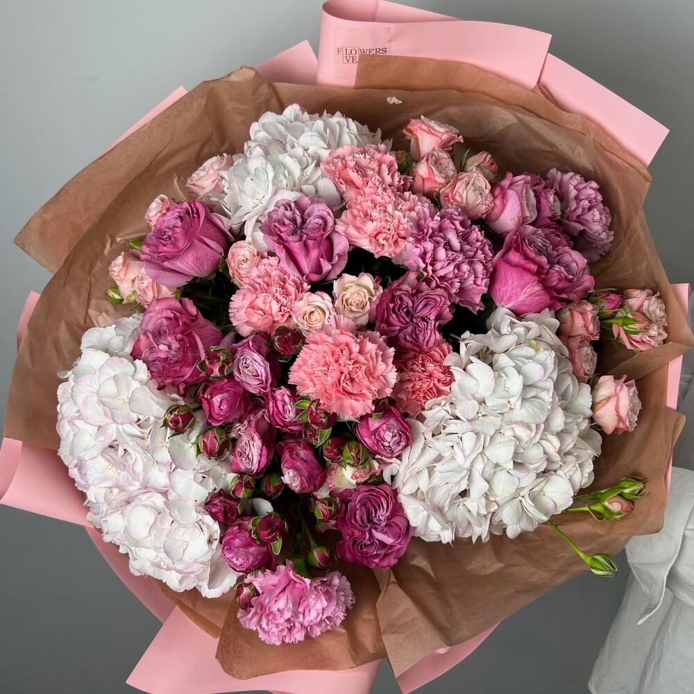 Сборная корзина из гортензий, лизиантусов, гвоздик, хризантем и роз