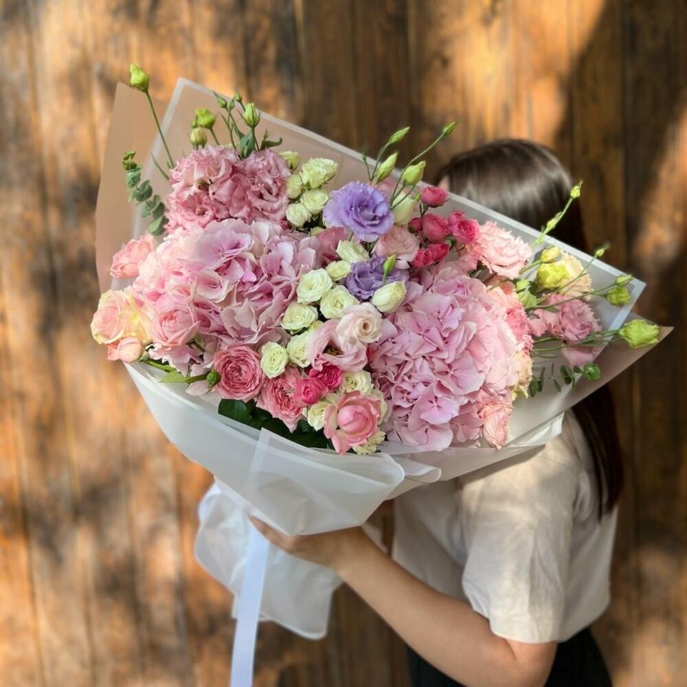Альстромерии, Гортензии, Кустовые розы, Лизиантусы, Розы, Хризантемы