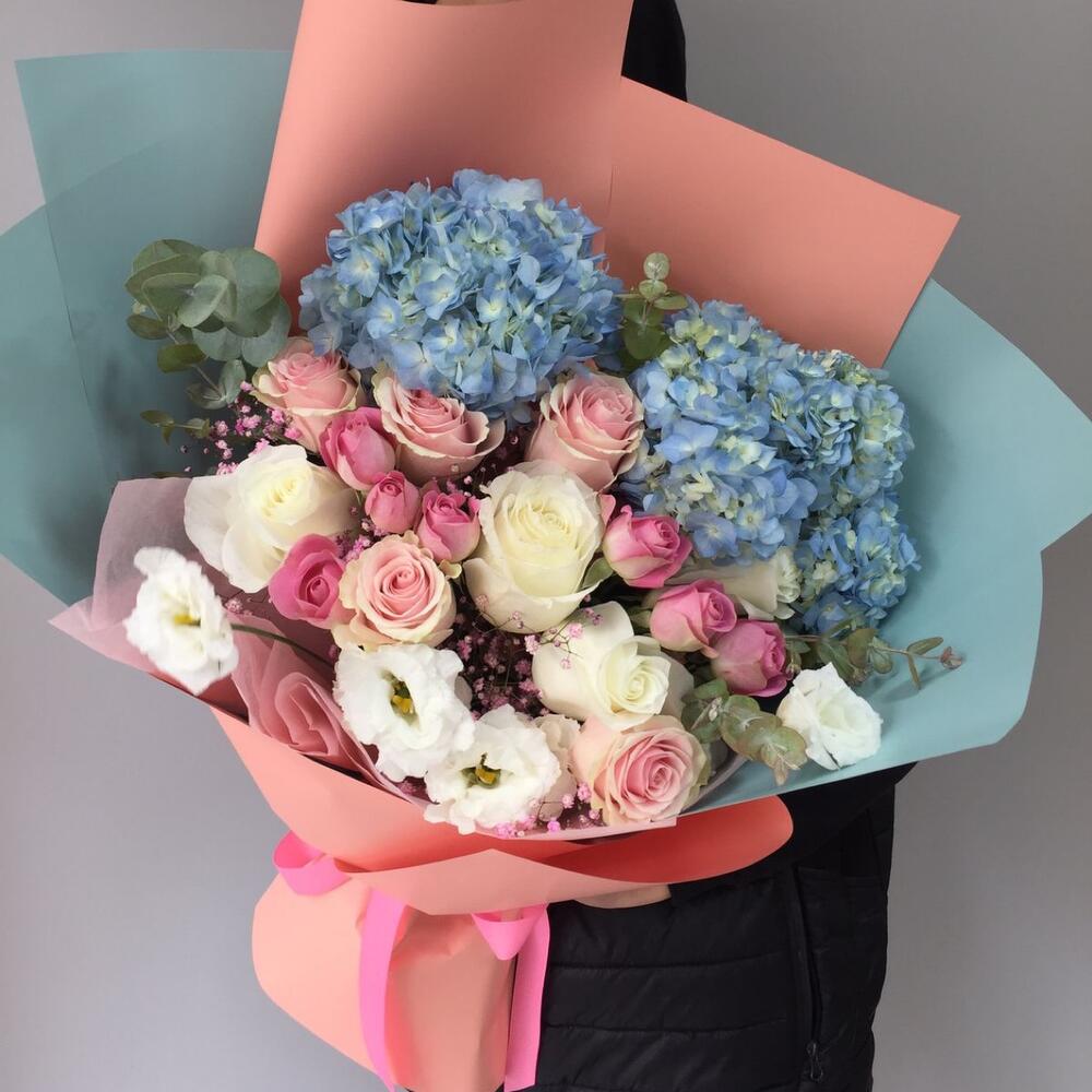 Альстромерии, Гвоздики, Кустовые розы, Лизиантусы, Розы, Хризантемы