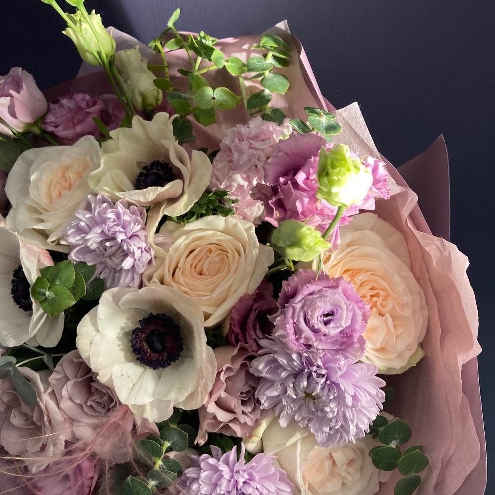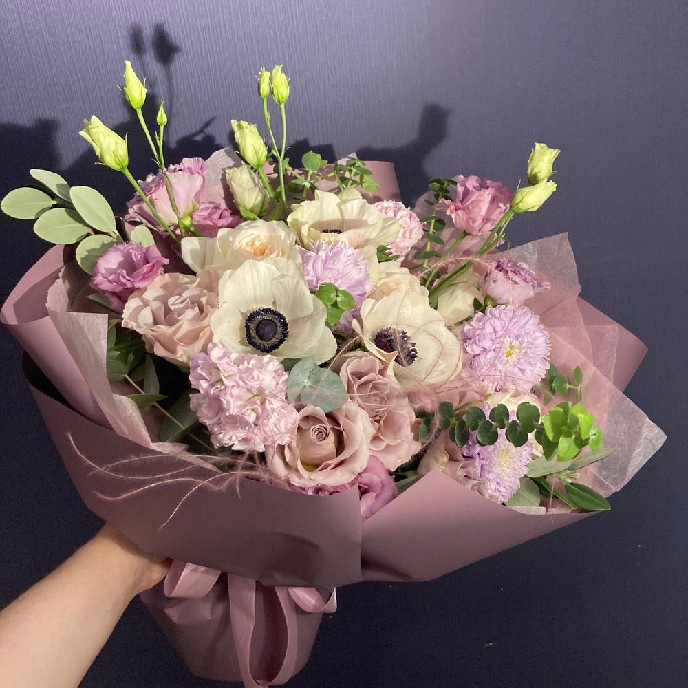 Авторский букет с анемонами, лизиантусом, ковылем, пионовидными розами, эвкалиптом, астрами и маттиолой.Стильное цветочное решение для любого случая.