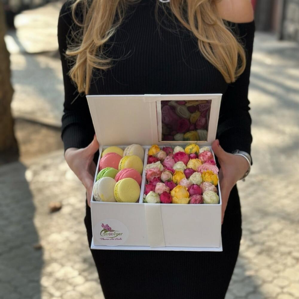 кустовые розы – 7 шт. Макарон – 8 шт.