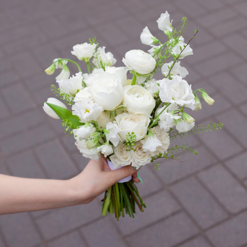 Ранункулюс – 2 шт.Пионовидная роза – 5 шт.Латирус – 7 шт.Лизиантус Алиса белый – 3 шт.гринбелл ветка – 1 шт.Тюльпан белый – 3 шт.Роза кустовая – 2 шт.