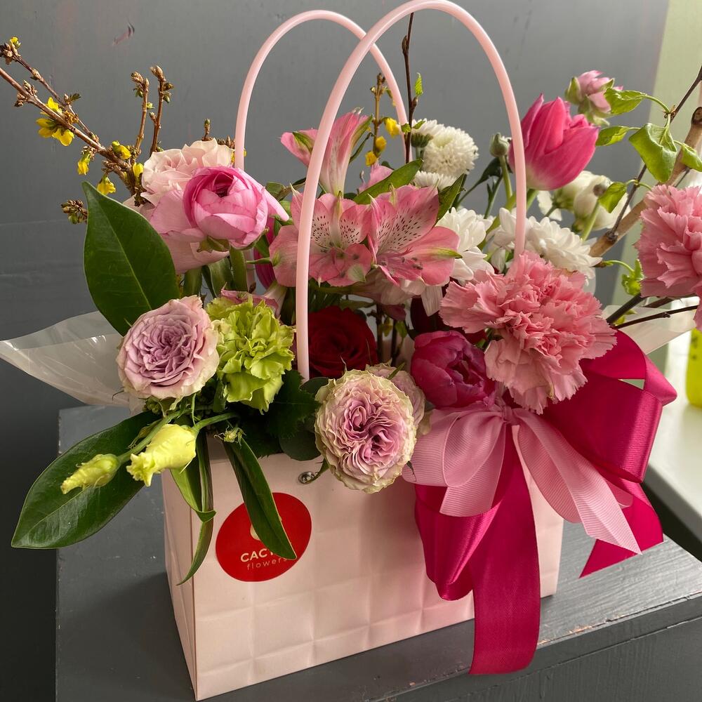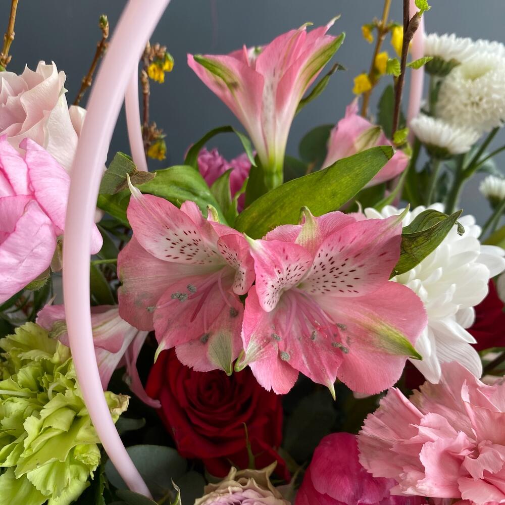 Альстромерии, Гвоздики, Кустовые розы, Лизиантусы, Розы, Хризантемы