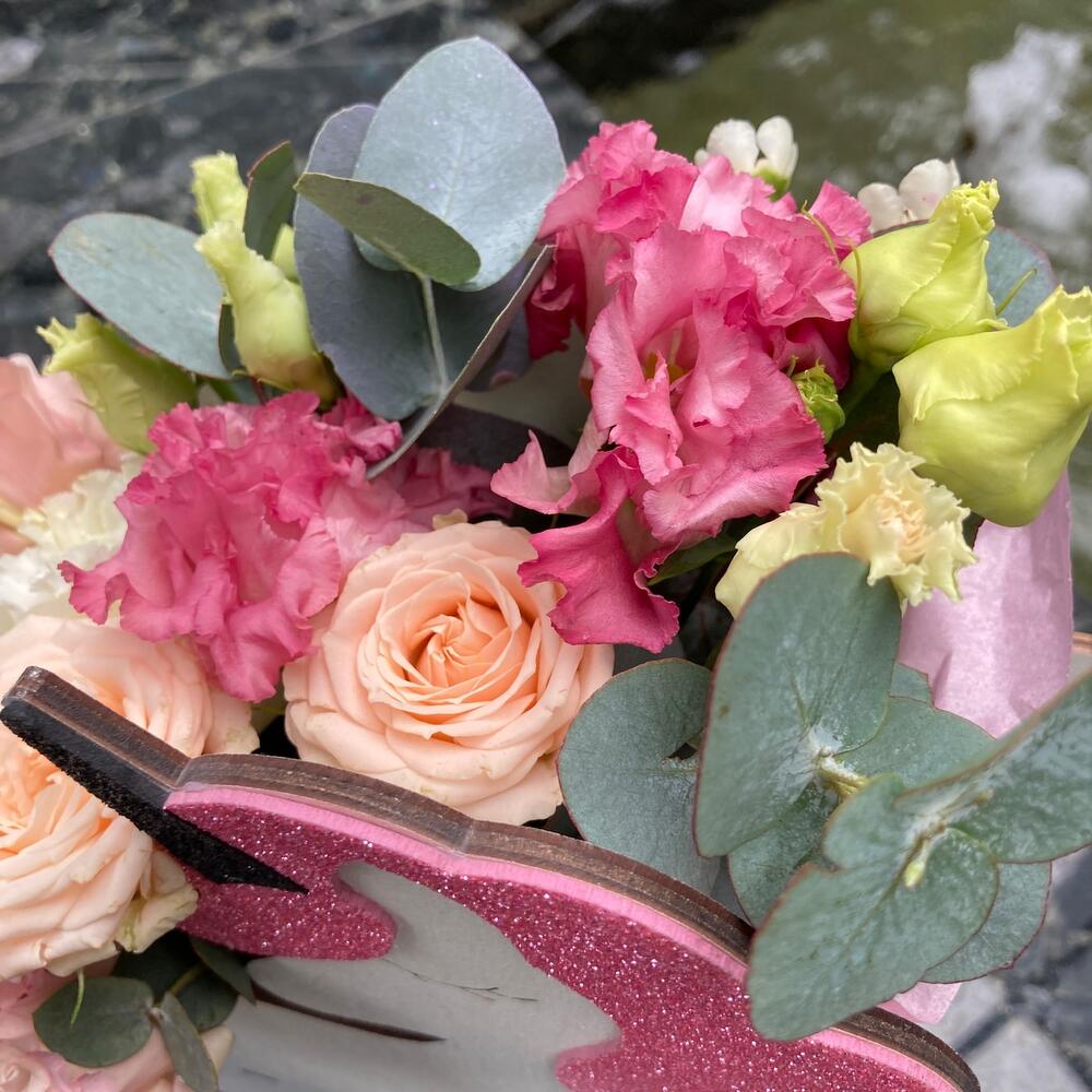 Волшебный сон - композиция из лизиантуса, роз и ваксфлауэра в декоративном ящике «Единорог»