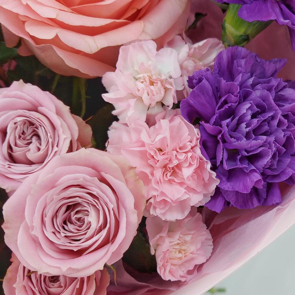 Нежный, ароматный, стильный букет в розово-сиреневых тонах. Такой букет всегда уместен и подойдёт для любого повода: День Рождения, именины, годовщина свадьбы, рождение ребенка, 8 марта, День Святого Валентина, выпускной и т.д. Можно вручить маме, сестре, подруге, коллеге, учителю, любимой.