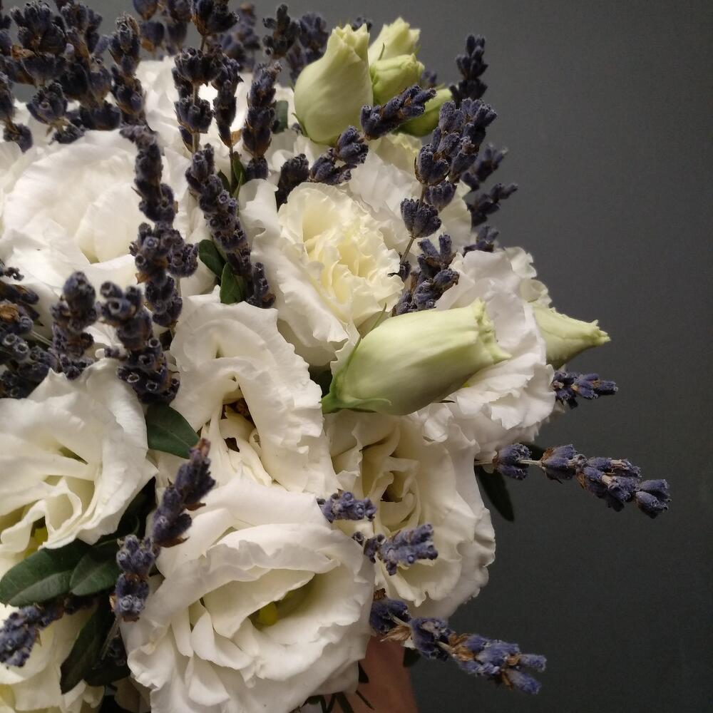 Лизиантус – 8 шт.Лаванда сухоцвет – 45 шт.Зелень – 6 шт.Лента атласная – 3 шт.