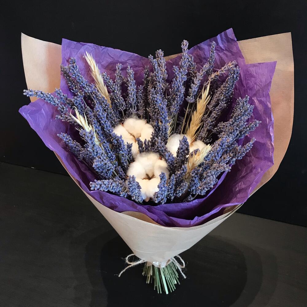 Лаванда сухоцвет – 1 шт.Хлопок натуральный – 3 шт.Колосья – 5 шт.Тишью – 1 шт.Крафт упаковка – 1 шт.бечевка натуральная – 1 шт.