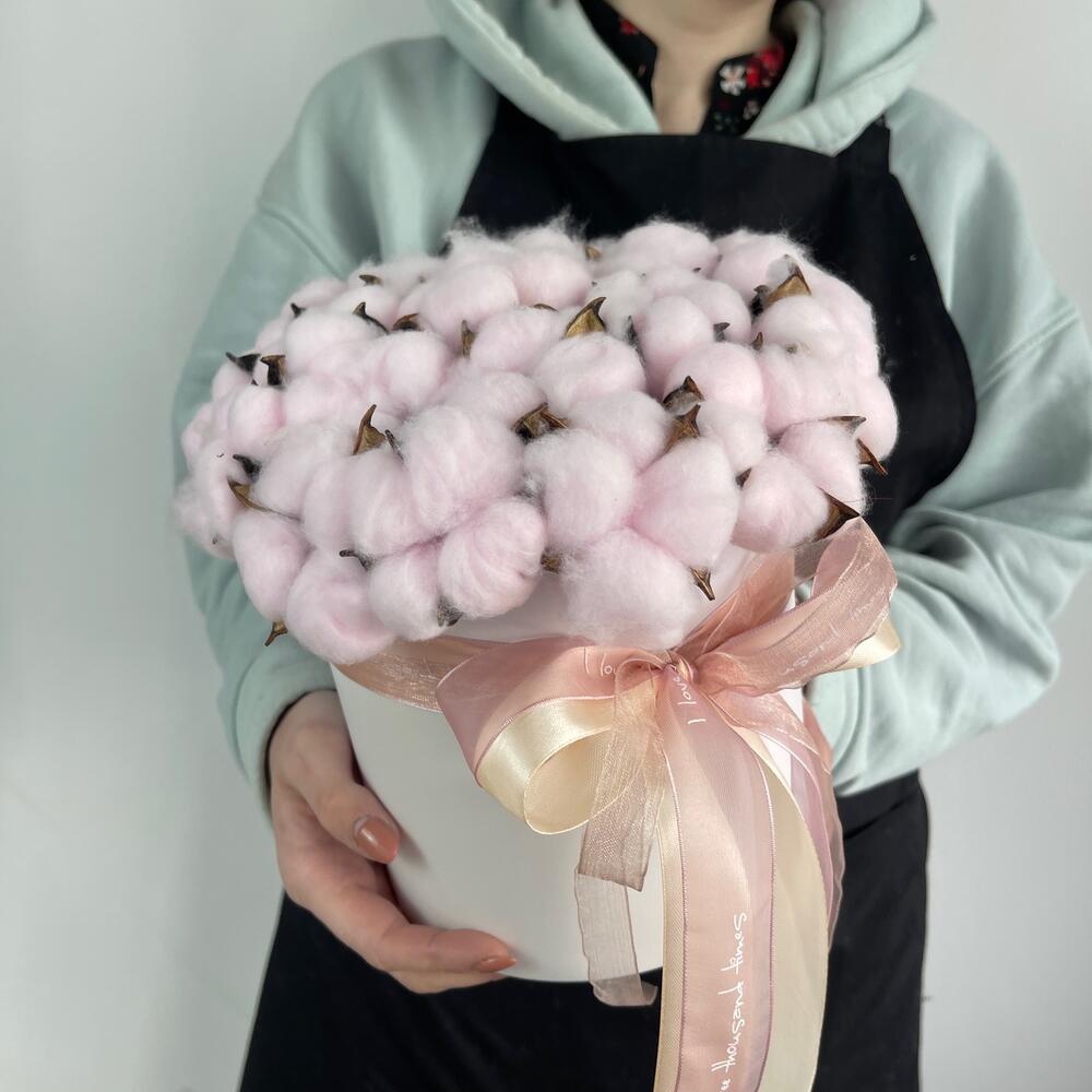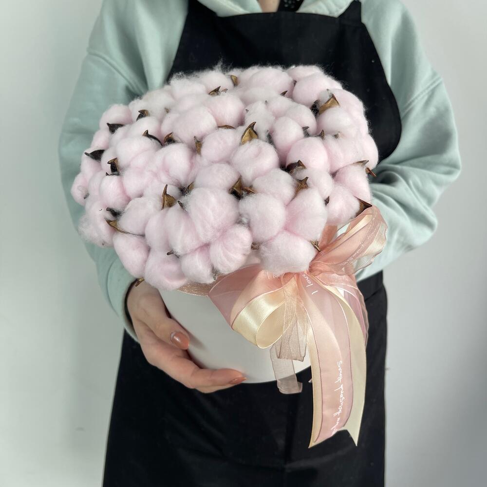 Хлопок – 21 шт.Коробка шляпная – 1 шт.Оазис флористический – 1 шт.