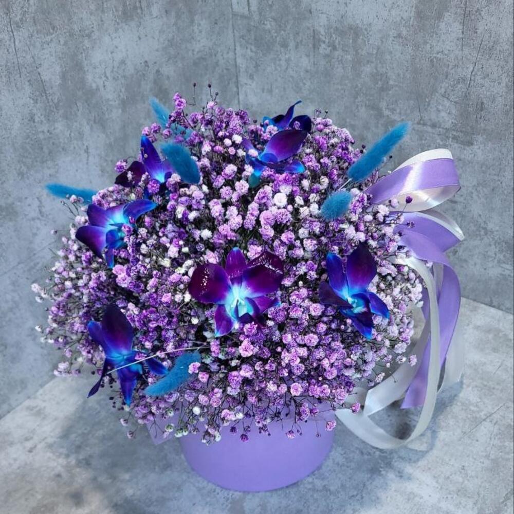Гипсофила – 6 шт.Орхидея Дендробиум – 8 шт.Шляпная коробка – 1 шт.Лагурус – 7 шт.Оазис флористический – 1 шт.