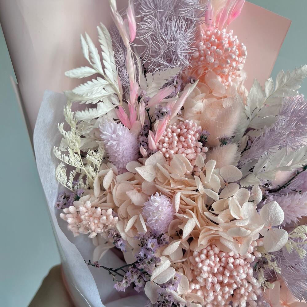 Гортензия – 1 шт.Лимониум – 2 шт.Озотамнус – 1 шт.Аспарагус – 1 шт.Упаковка дизайнерская – 1 шт.Лагурус – 7 шт.Фаларис – 5 шт.Овес – 4 шт.кармек – 2 шт.