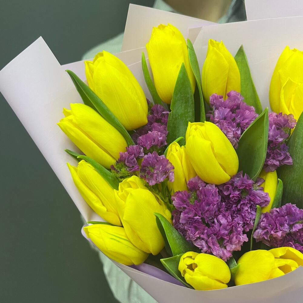 Тюльпан желтый – 15 шт.статица ярко-розовая – 1 шт.Упаковка корейская пленка – 1 шт.Лента атласная – 1 шт.
