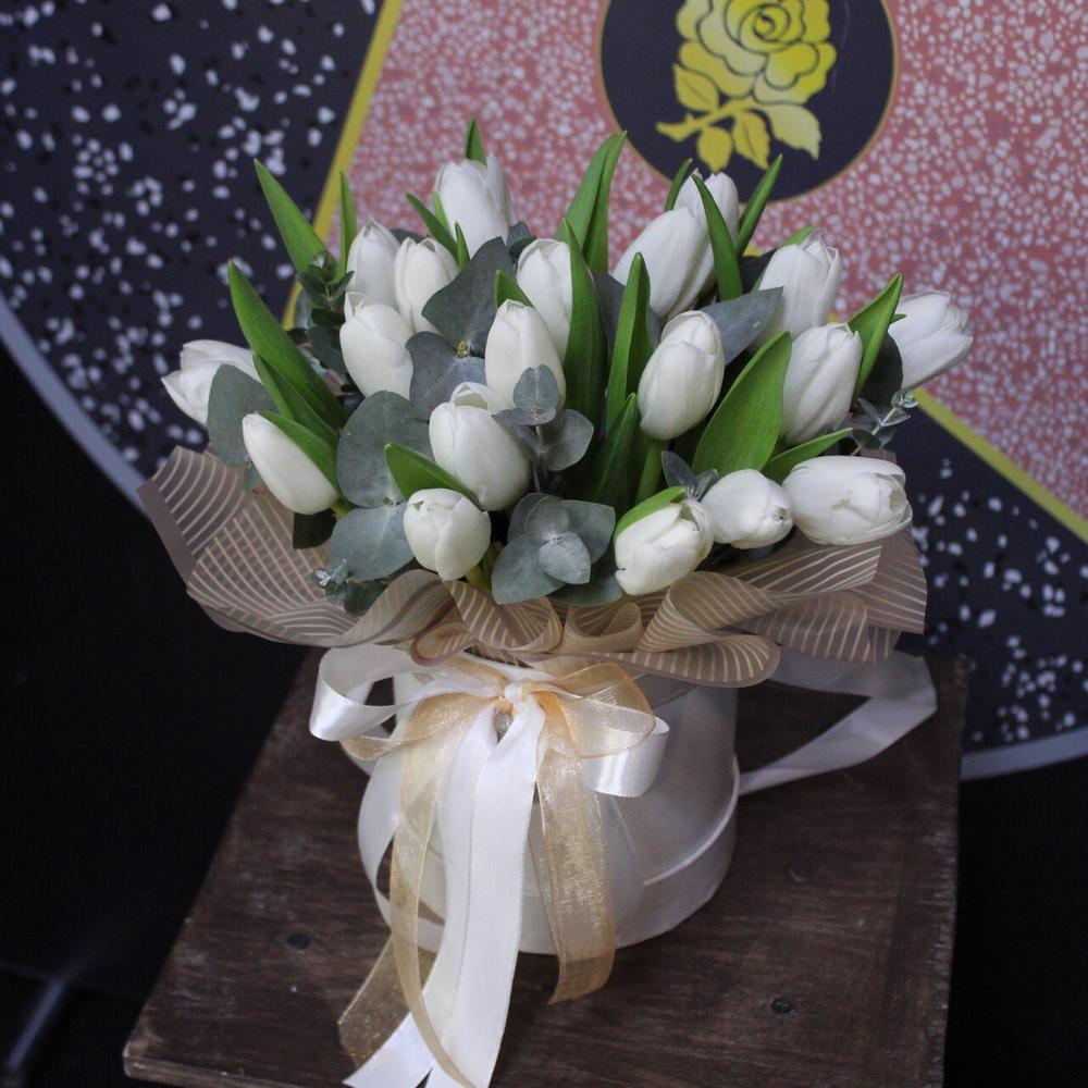 Эвкалипт – 2 шт.Шляпная коробка – 1 шт.Тюльпан белый (голландия) – 19 шт.Пленка дизайнерская – 2 шт.